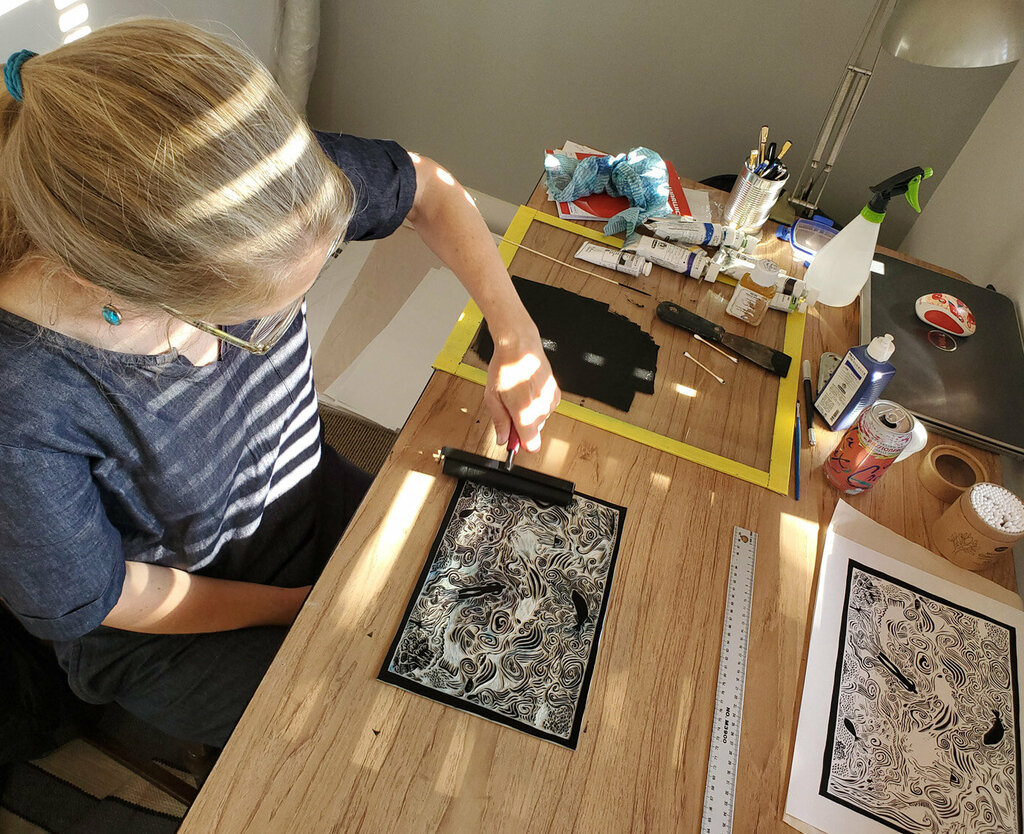 I primarily make prints but have many other interests, including painting, sewing, and a love of fibre and fabric which sometimes crosses over into my artwork and vice versa.